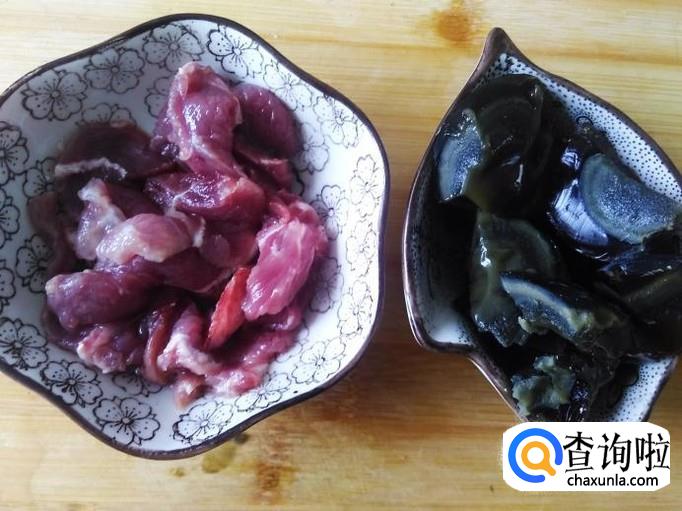 瘦肉切成薄片,皮蛋切成小丁。