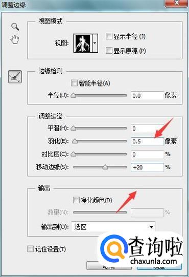 得到选区之后我们在上面找到调整边缘选项,,点击该选项在弹出的对话框内调节参数如图所示: