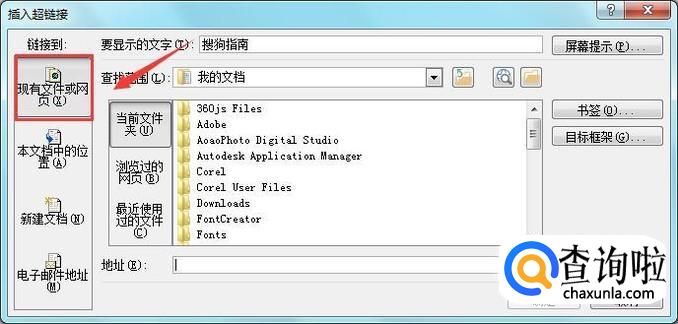 点击超链接选项在弹出的对话框内我们选择现有文件或网页选项,如图所示: