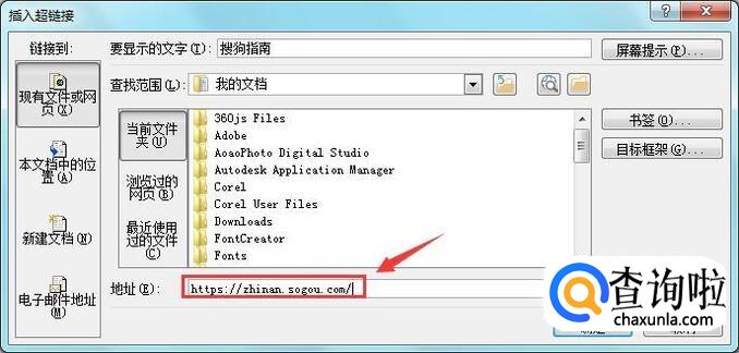 点击现有文件或网页选项在里面找到地址选项,在地址的输入框内输入我们的链接,如图所示: