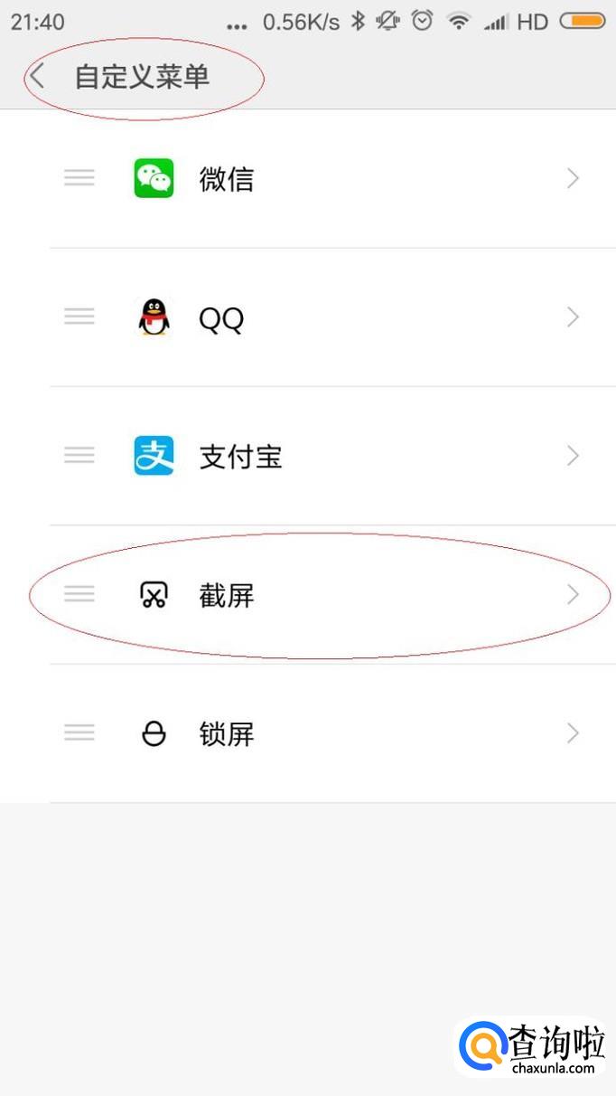 如图所示,唤出"自定义菜单"选项。用于自定义悬浮球功能菜单,选择"应用程序→截屏"项。