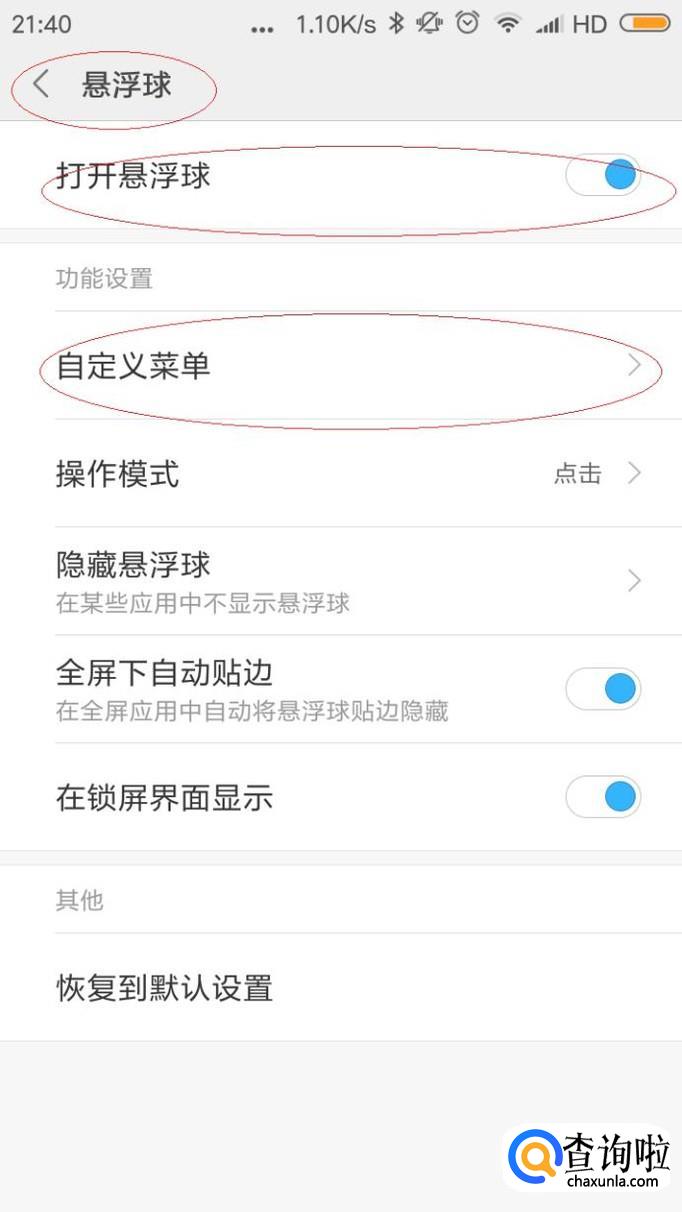 唤出"悬浮球"选项,如图所示。开启"打开悬浮球"项控制按钮,点击"自定义菜单"右侧向右箭头。