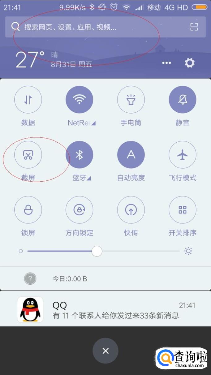 亦可唤出通知栏点击"截屏"按钮截屏,如图所示。或同时按"菜单键+音量减键"(快捷键)截屏,本例到此希望对大家能有所帮助。
