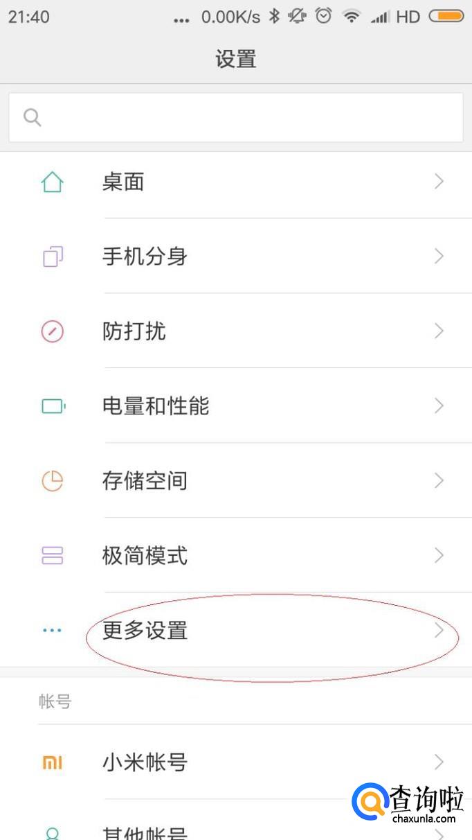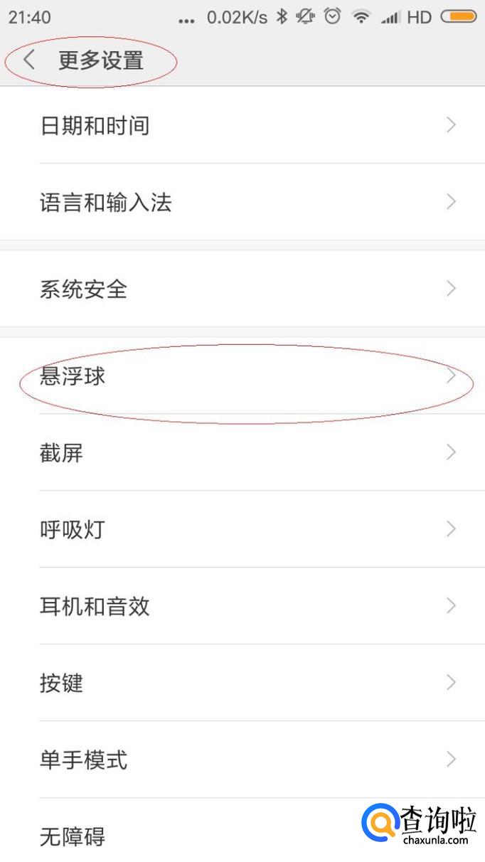 如图所示,唤出"更多设置"选项。垂直滑动选项区域,点击"悬浮球"项右侧向右箭头。