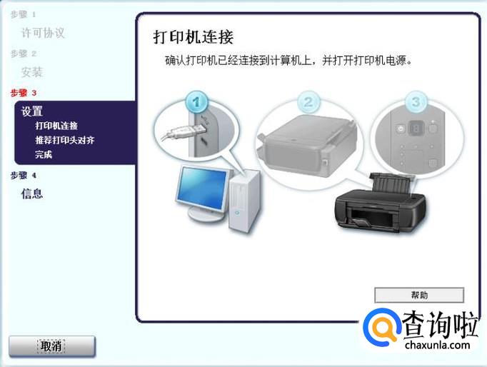点击安装之后,就会执行安装程序,这个过程大概得几分钟,等进度条结束后,会提示打印机连接,此时,把打印机加电,并连接电脑。