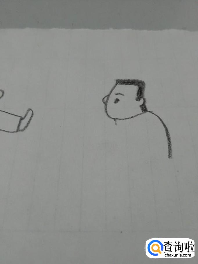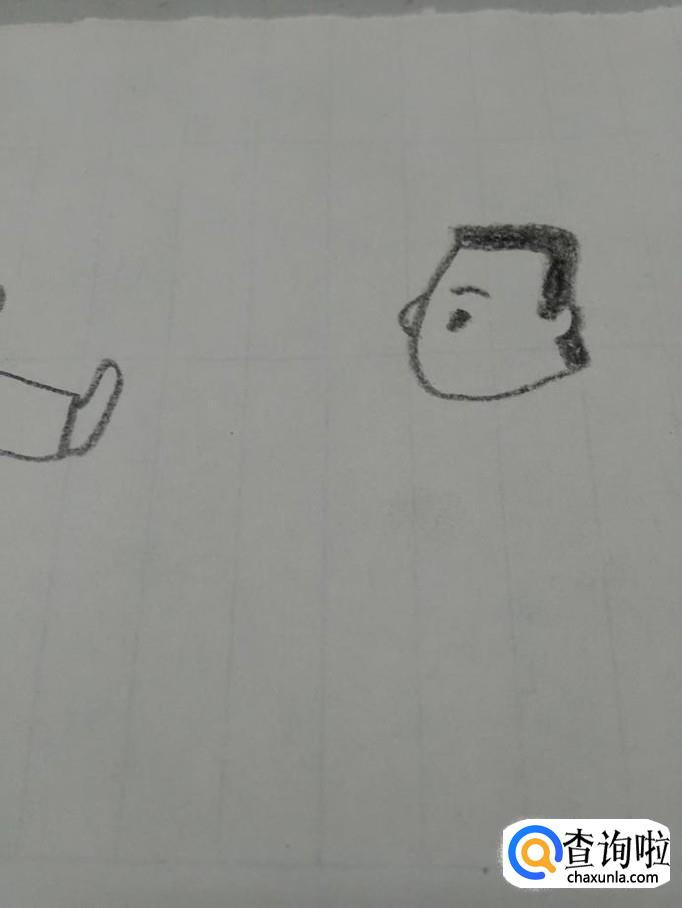 在头发下面,画一个半圆形,表示耳朵,在耳朵下面,画一个小方块,表示耳朵下面的头发。