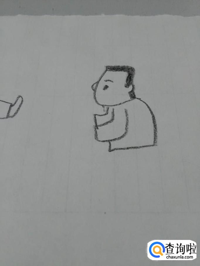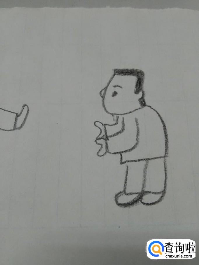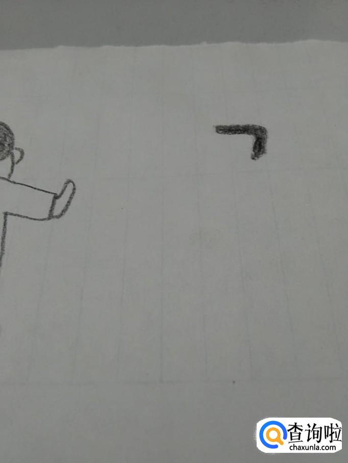 在胳膊下面,画一条折线,表示他的上衣。
