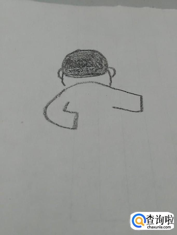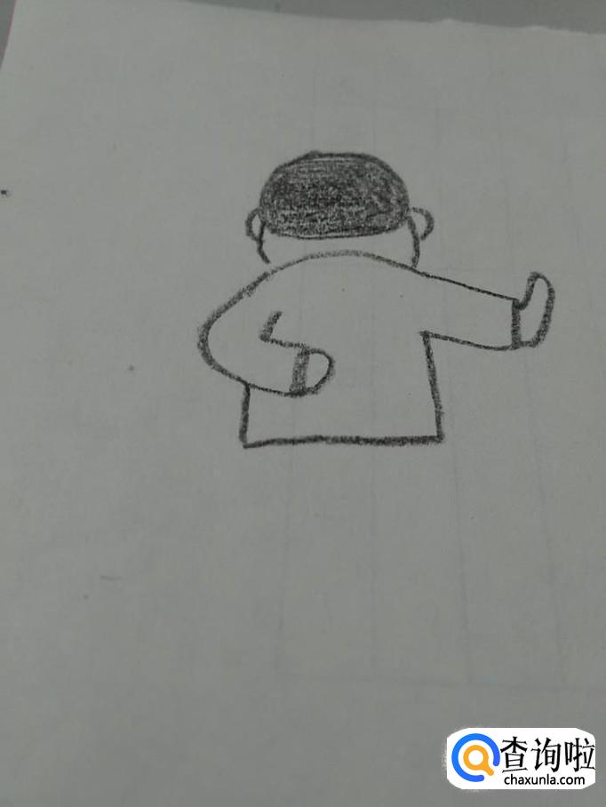 在肩膀下面,画两个条形,左边的条形画成两条折线,表示胳膊是背在身后的,右边的胳膊是平的。