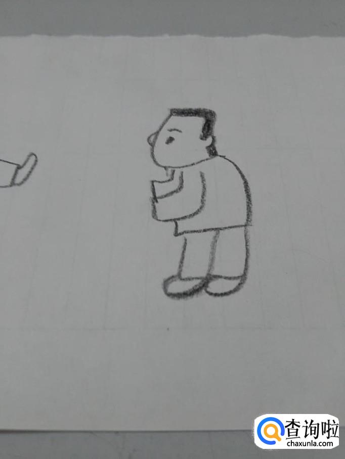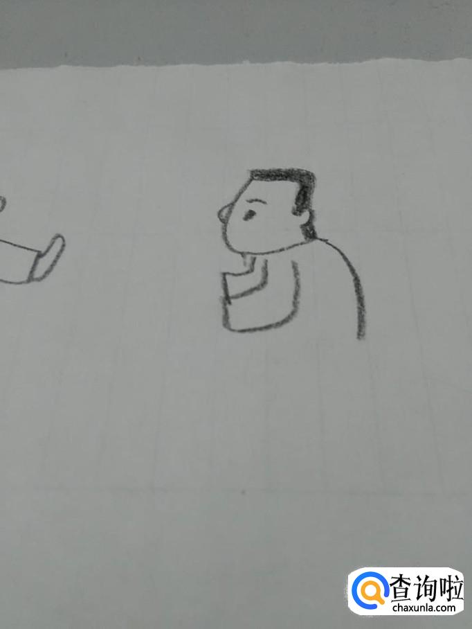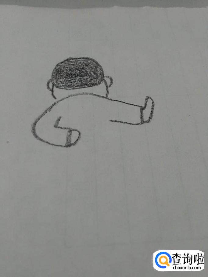 在头的下面,画一条弧线,表示这个人躬着的背。