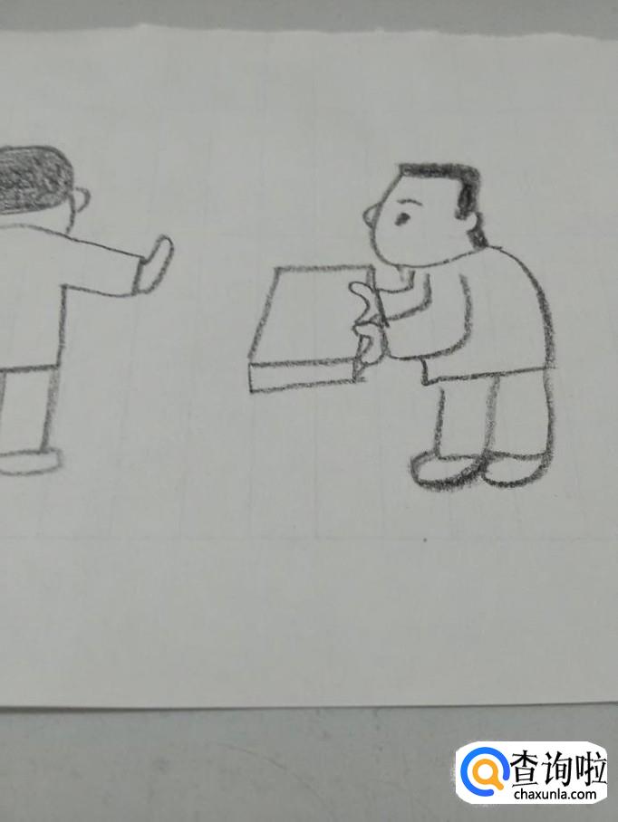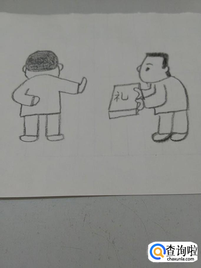 在上衣的下面,画两个长方形,表示腿,在腿的下面,画两个椭圆形,表示两只脚。这个人就画完了,这是一个正在拒绝收礼、廉洁的干部。