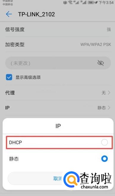 弹出的界面,我们选择DHCP,之后我们进行保存,然后我们就可以上网了。不能上网的原因就是IP地址被我们设置成了静态的缘故导致的。