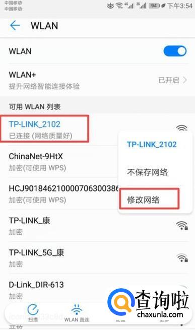 然后我们长按连接的无线网络,弹出的界面,我们点击修改网络;