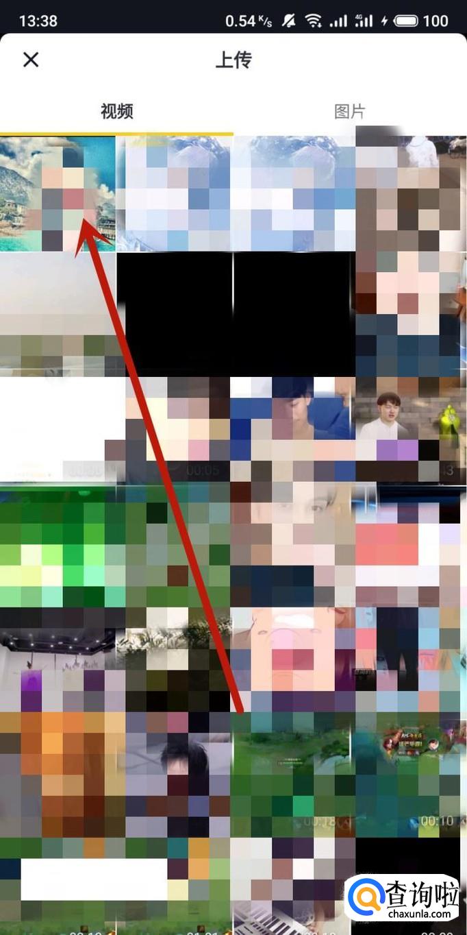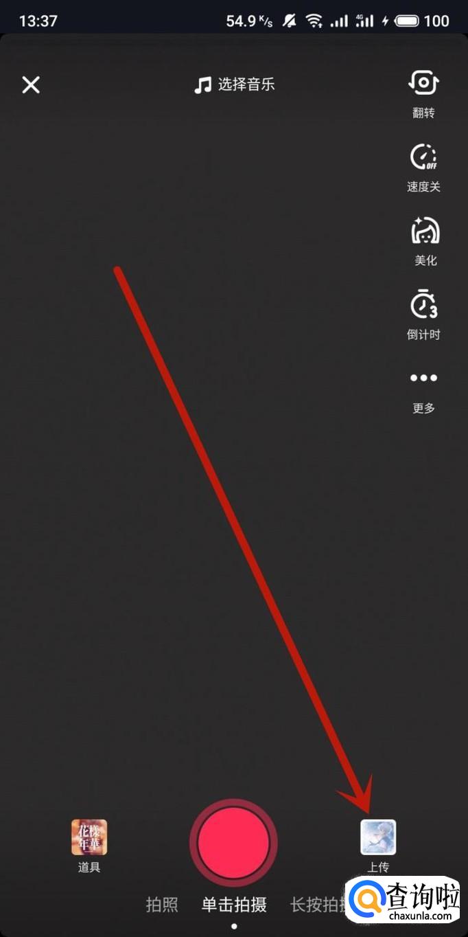 进入抖音的拍摄页面,点击“上传”,如图所示。
