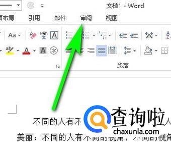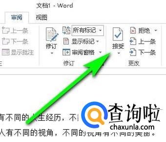 鼠标移到菜单栏这里,点击:审阅;下面展开相关内容。再点:接受
