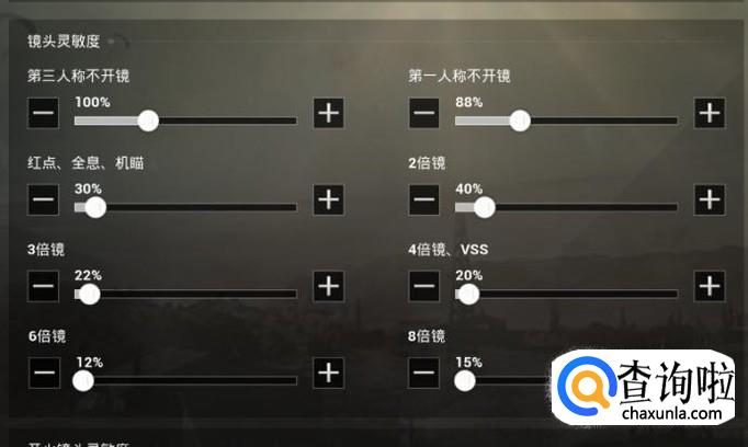 关于镜头灵敏度设置,将第三人称不开镜设置为100%,2倍镜设为40%,8倍镜设为15%