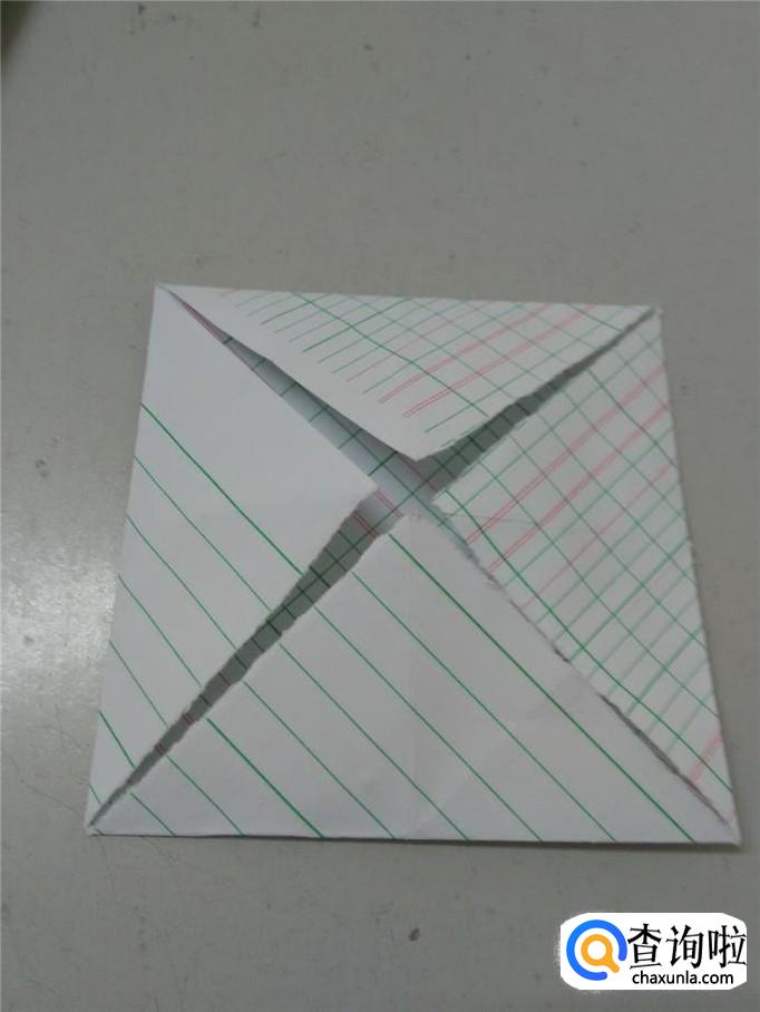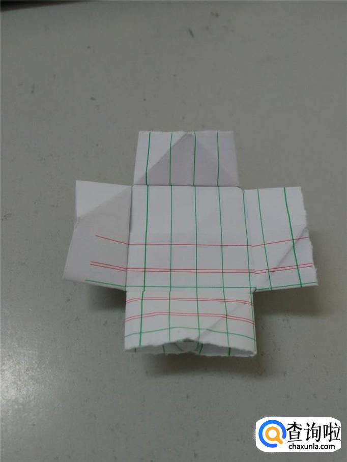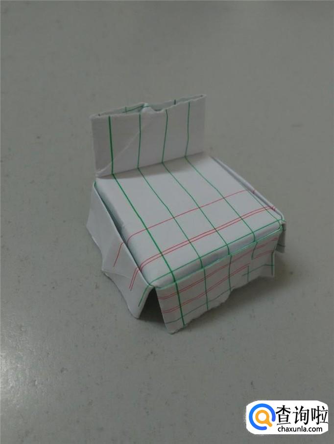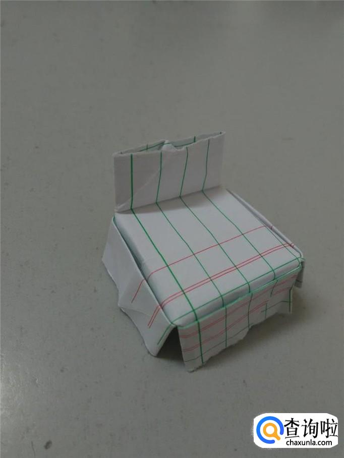 把一个小长方形立起来当作靠背,其他三个小长方形向下折,当作凳子腿,小板凳就折完了。