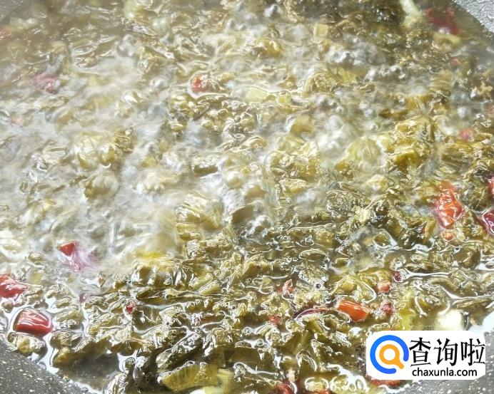 等锅中炒出香气以后,加入适量开水,少许鸡汁。水开以后煮5~6分钟,加盐和味精调味。用漏勺捞出酸菜放入碗中备用。
