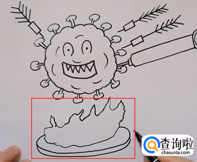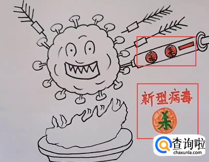 病毒怕高温,我们在病毒的下面画一团火,代表我们要多管齐下齐心协力抗击病毒。