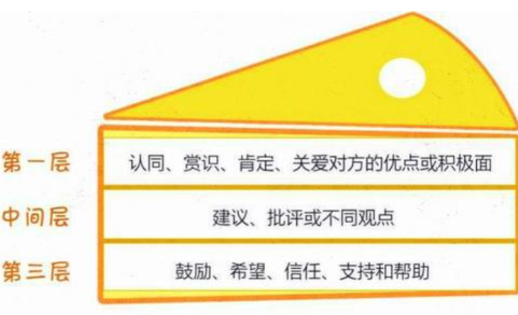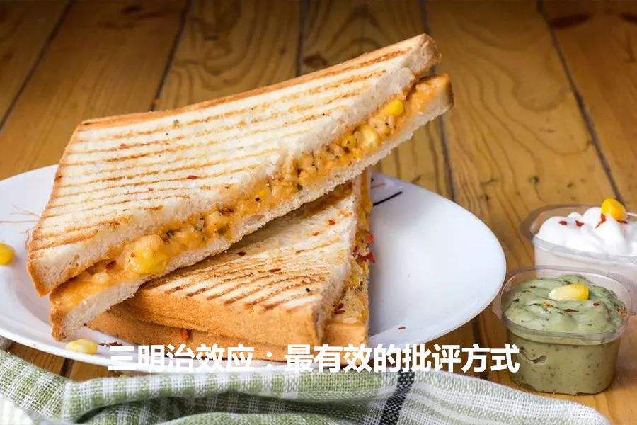 在批评心理学中,人们把批评的内容夹在两个表扬之中从而使受批评者愉快地接受批评的现象,称之为三明治效应。这种现象就如三明治,第一层总是认同、赏识、肯定、关爱对方的优点或积极面,中间这一层夹着建议、批评或不同观点,第三层总是鼓励、希望、信任、支持和帮助,使之后味无穷。这种批评法,不仅不会挫伤受批评者的自尊心和积极性,而且还会积极地接受批评,并改正自己的不足方面。