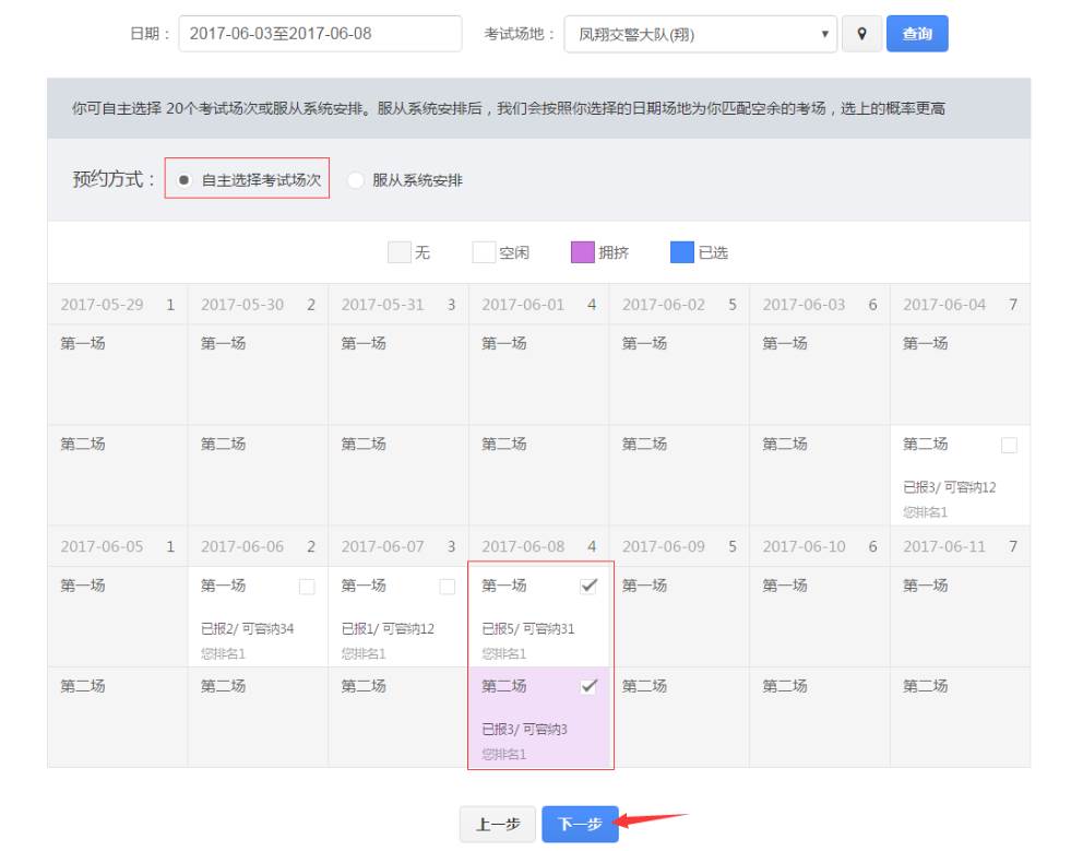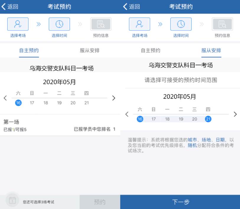 在驾考预约考科目考试中,自主选择考试场次,系统会根据用户的考试时间来显示当前的优先级排名。排名越靠前,就意味着用户很有可能预约上该场次,反之则有可能预约失败。