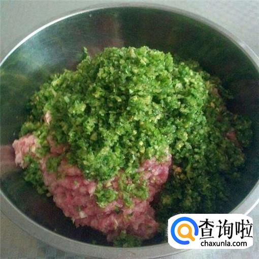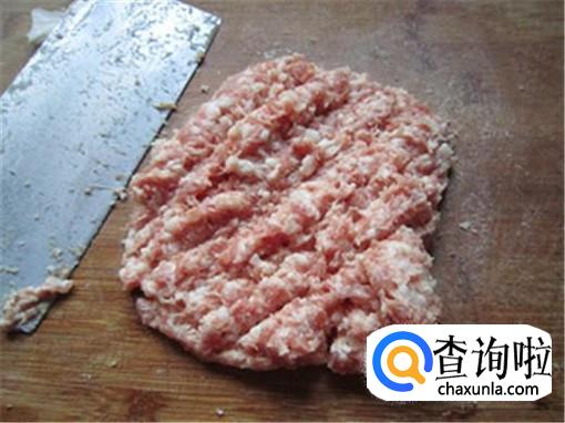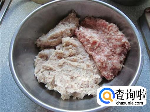除了鲅鱼馅,我们还要准备五花肉馅,也是将五花肉剁成肉馅备用,将鲅鱼馅和五花肉馅混合在一起。