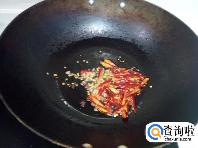 锅内放入油加热,油热后放入花椒,红干椒爆香,放入火腿肠小火翻炒。