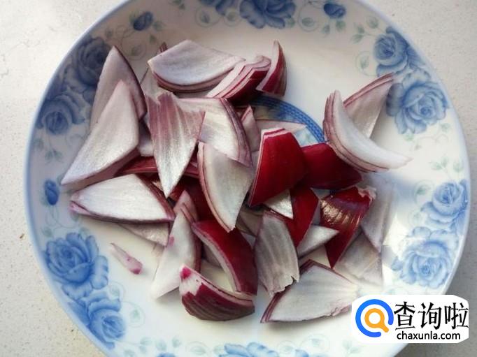 圆葱去皮,用水清洗干净,切成片。