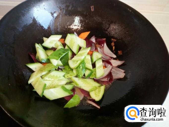 放入圆葱大火爆炒,放入少许料酒,滴少许醋。圆葱炒至六分熟,放入黄瓜片翻炒,放入盐。