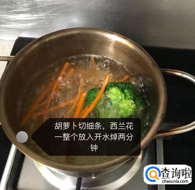 接着将胡萝卜切成细条和西兰花一起放入锅中焯两分钟,如图所示。