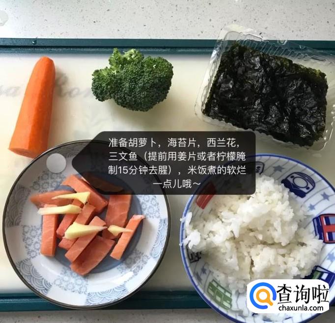 首先准备好要用的胡萝卜、海苔片、西兰花、三文鱼和米饭,如图所示。