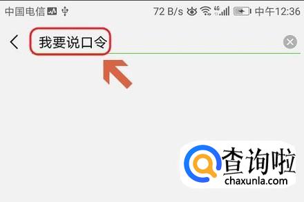 在弹出的小程序搜索页面,我们点击右上角的放大镜图标,然后输入“我要说口令”;