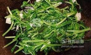 拿出锅,锅中放油,把刚刚切好的蒜末和姜末放入油锅中煸炒,10秒钟后就可以放入豌豆尖。翻炒均匀。