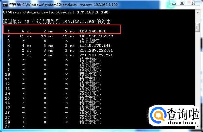 如果后面显示请求超时的话,它会再此探索该路由器,没有超时的话,会显示需要的时间,还有距离,如下图所示: