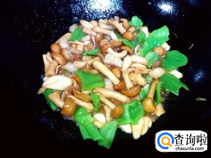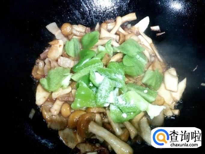 炒至杏鲍菇变软,放入滑子蘑翻炒。滑子蘑略翻炒一下,放入青椒翻炒,放入盐。