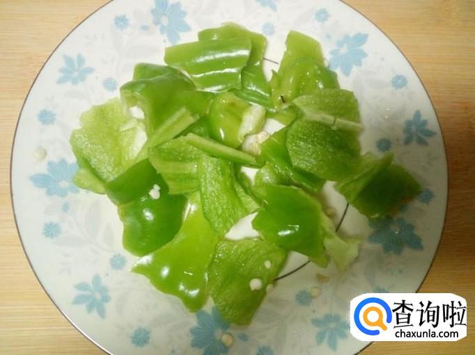 青椒用水清洗干净,控干水分,用手撕成片。切好葱,姜,蒜,备用。
