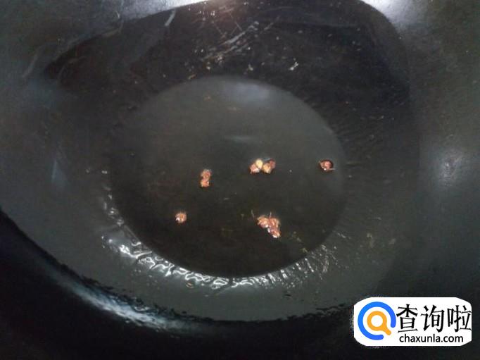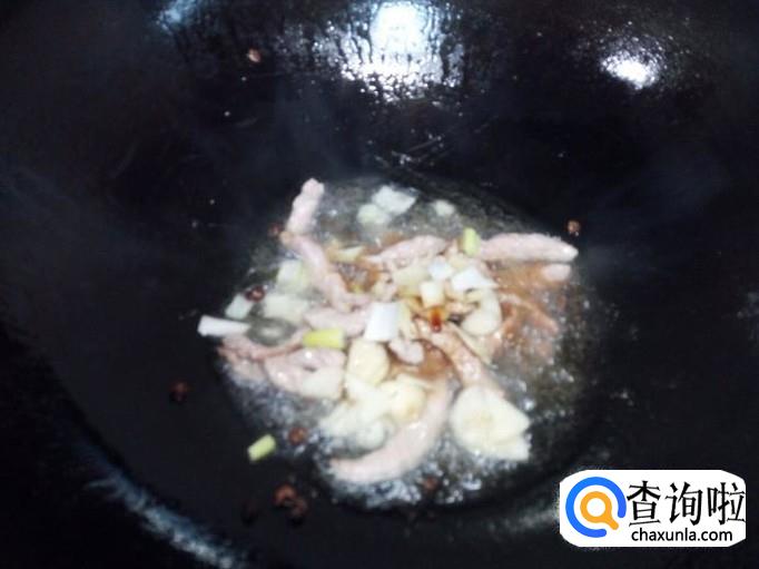 锅里放入油加热,油热后放入花椒爆锅,放入肉翻炒。