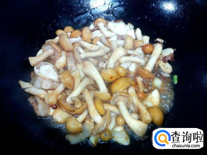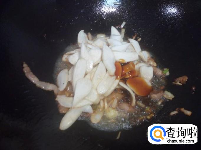 炒至肉颜色微白,放入葱,姜,蒜翻炒,放入少许酱油。随即放入杏鲍菇翻炒,放入料酒,一小匙儿蚝油。