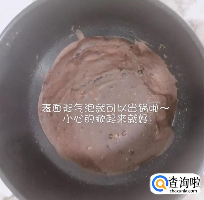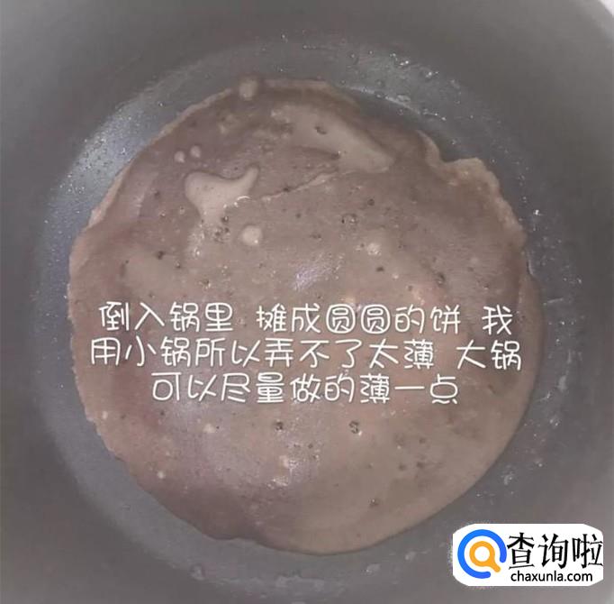 接着倒入锅中,烙成一个圆圆的饼,如下图所示。