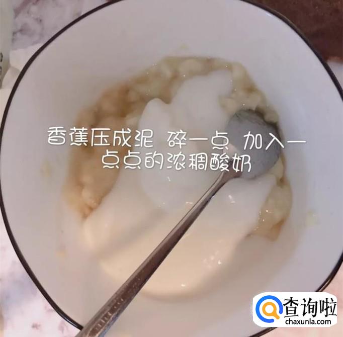 接着将香蕉压成泥,加入一点点的浓稠酸奶,搅拌均匀,如下图所示。