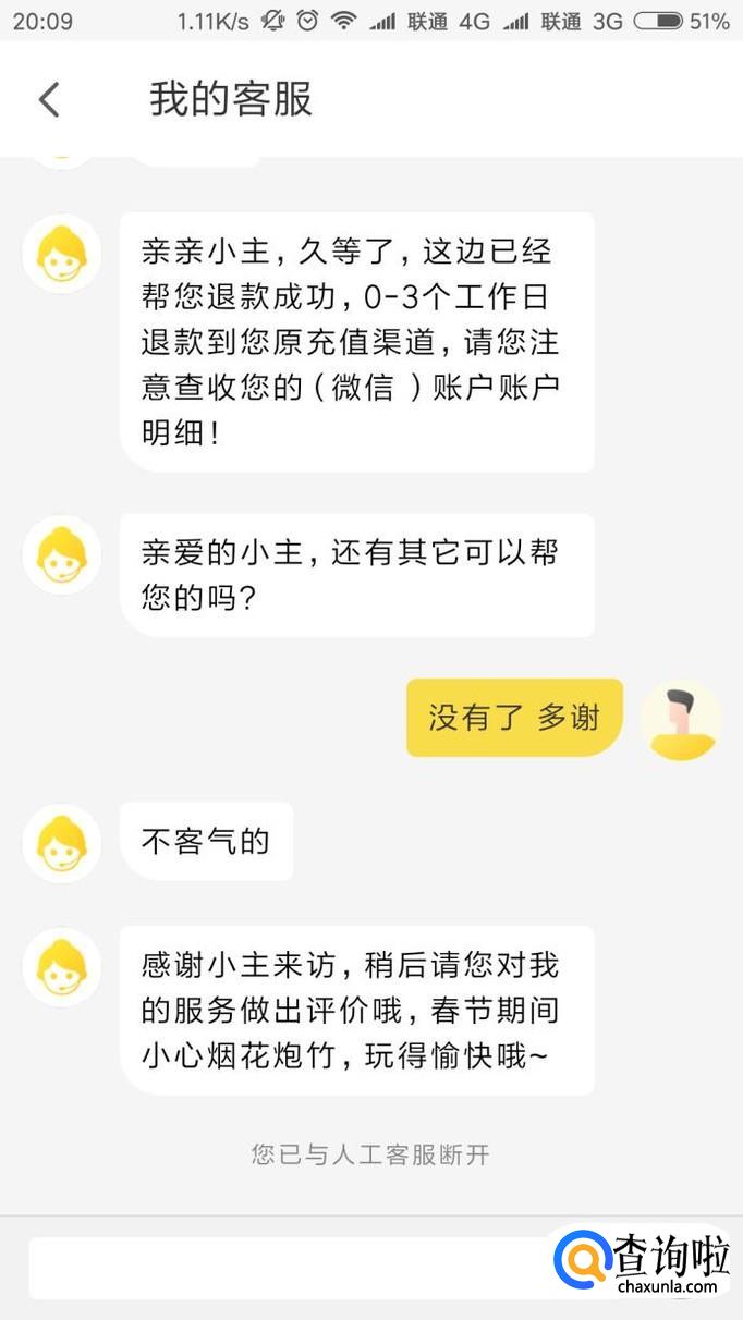 等待客服信息核实完毕之后,会询问我们是否要求退款,我们回复确认退款之后,然后客服将为我们操作进行退款,稍等片刻之后,我们就会收到退款通知信息。