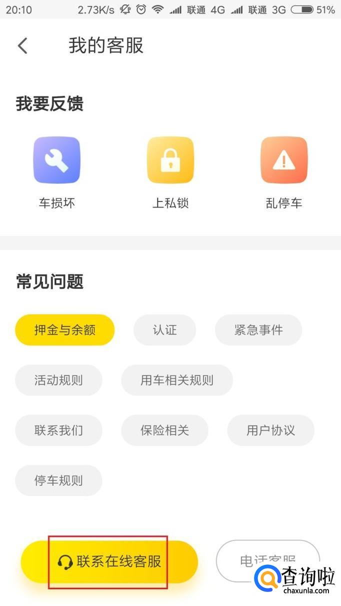接下来,在弹出的页面中,点击选择“联系在线客服”菜单按钮。