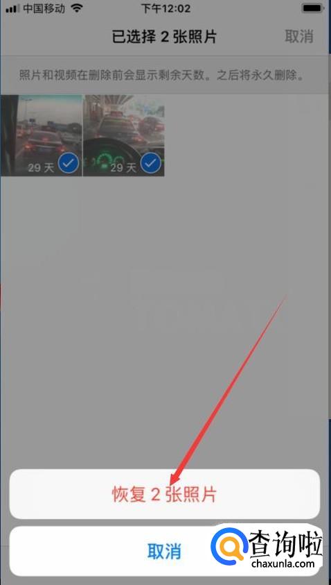 然后选择这两张照片,点击右下角的“恢复”字样,如图。