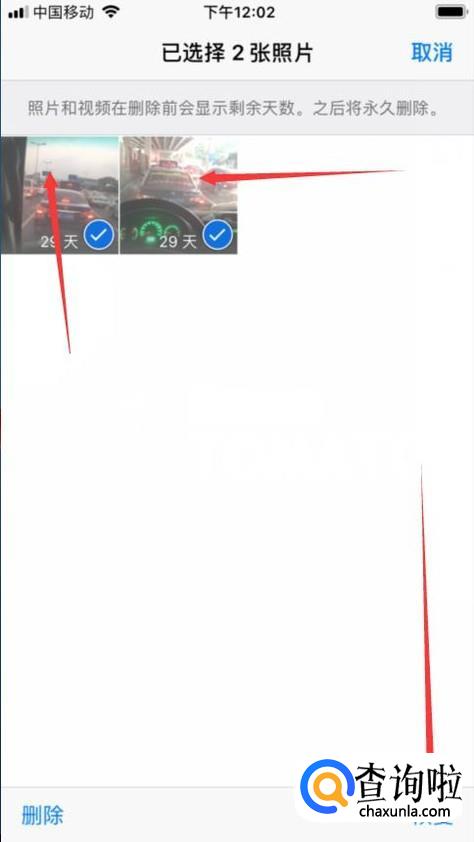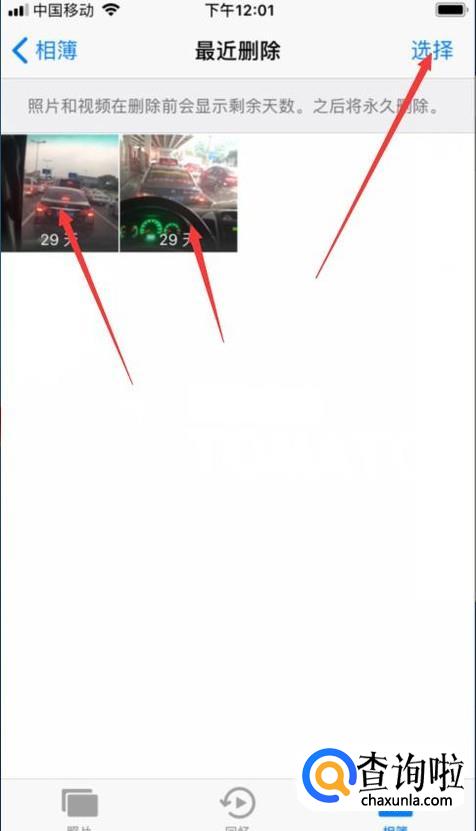 点击进入“最近删除”界面,然后右上角的编辑字样,就会发现删除的两张照片,如图。