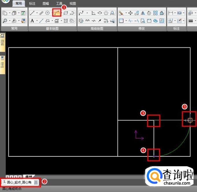 接下来就是绘制圆弧了,从第二个正方形开始,按照逆时针方向,如图绘制四分之一圆弧,后面圆弧的绘制方法类似,只是圆心和半径不同,但圆弧是连续的;