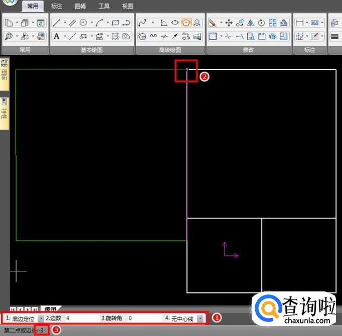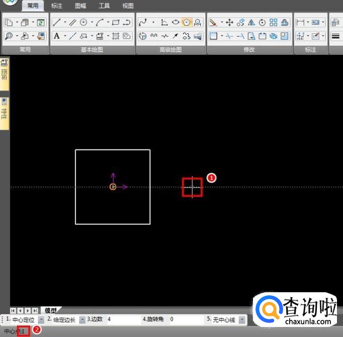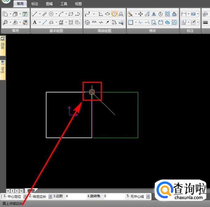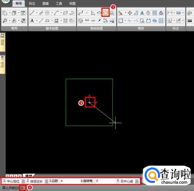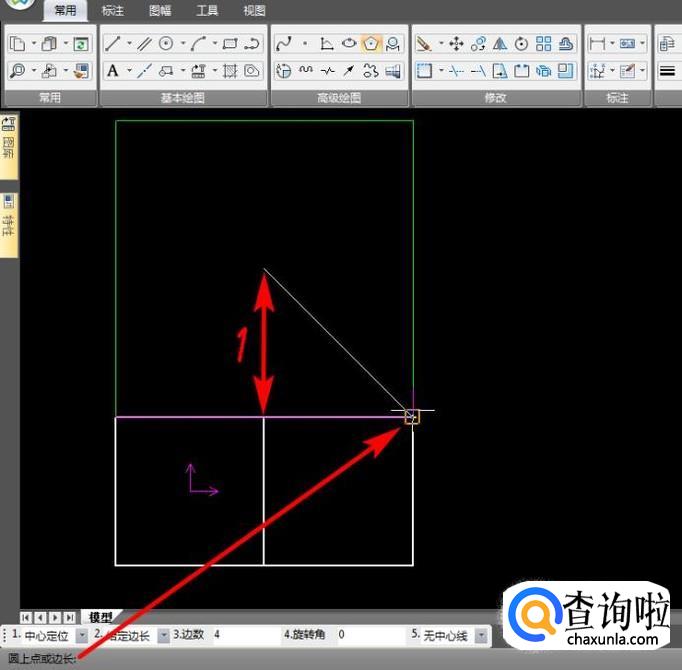 依旧使用“正多边形”功能,参考坐标原点,十字光标向右移,左下角输入1,回车;
