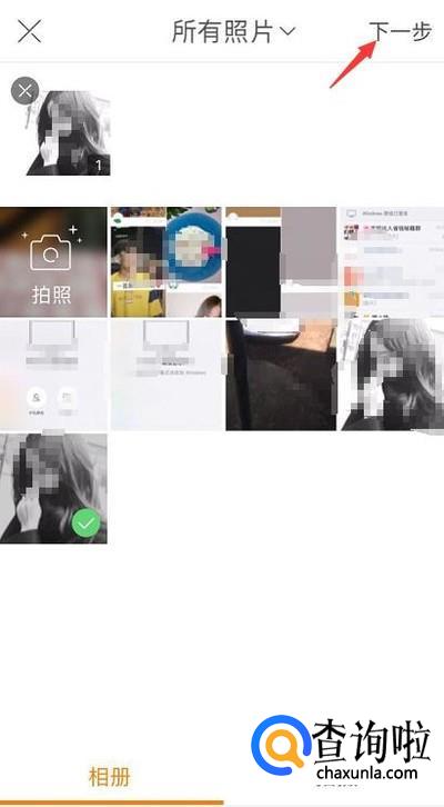 接着我们进入到相册里面选择一张你想要发布出去的图片,选好后点击右上角下一步。