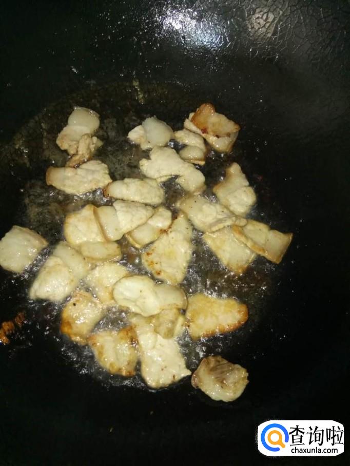 开火,加入适量的食用油,待锅里油温升高后,将五花肉下入锅里,煎至稍微出油;不要煎太久,不然肉变硬不好吃;