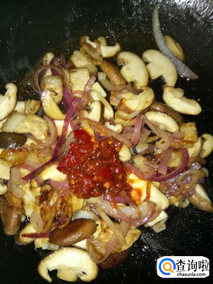 将香菇和蒜苗下入锅里,再加入一汤匙豆瓣酱、少量盐、少量味极鲜酱油、适量的鸡精,翻炒均匀至熟,即可。