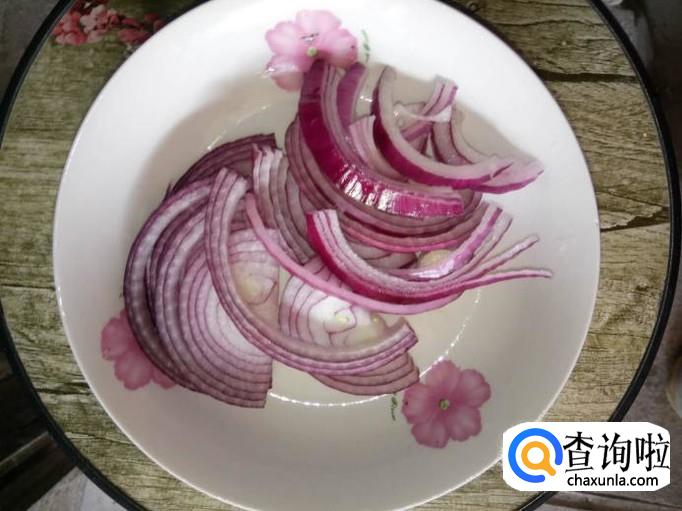 取半个洋葱,用刀将洋葱的头尾切掉,然后剥掉外膜,清洗一下,再竖刀切成小片(丝状);