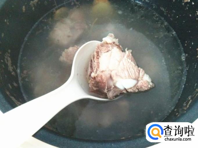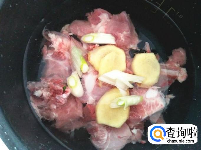 做这款汤不用煎炒烹炸,直接用电饭煲就能够做好,非常简单省事。电饭煲里加上几片生姜,要记得去皮,加上一些葱花,加上清水,把没有任何血水的排骨放进去,清水要一次性加足。
